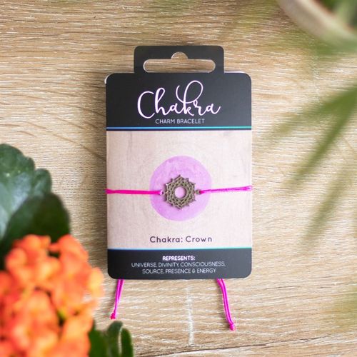 Balance and realign the crown chakra with this pink string and metal charm bracelet. Presented on a matching backing card that reads, 'Universe, divinity, consciousness, source, presence & energy'. Product Dimensions: H1.9cm x W2.4cm x D0.8cm Packaged Dimensions: H2.3cm x W13cm x D2cm